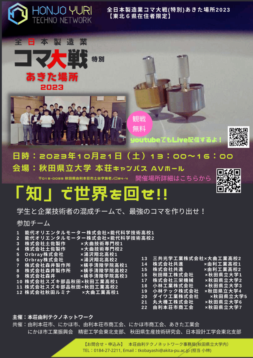 2023年10月21日に開催された「全日本製造業コマ大戦(特別)あきた場所」では、特に注目されたチームがありました。それは、森井株式会社と横手清陵学院高校の連携チームです。この大会は、東北6県在住者限定の特別なイベントであり、地域の技術力と創造力を競い合う場となりました。